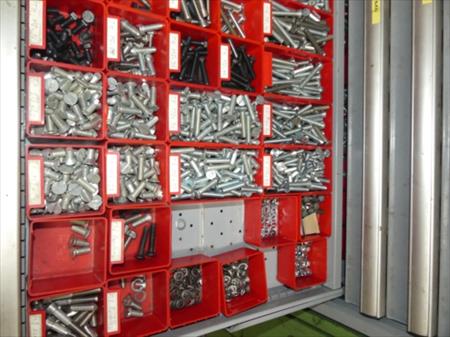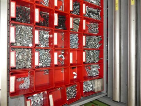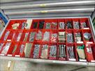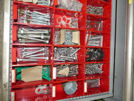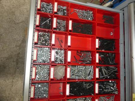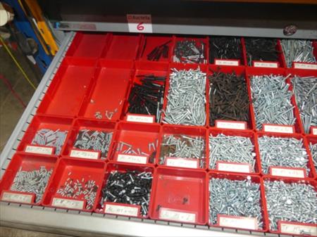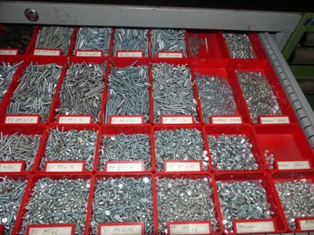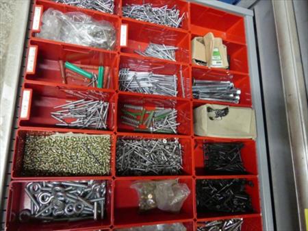 Quincaillerie avec armoire 8 tiroirs Longueur : 102 cm Largeur : 58 cm Hauteur : 71 cm Etat : Matériel neuf Vis métrique de M3 à M10, goupies, serre clips, ... Lot tel que sur photos