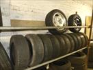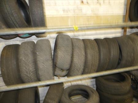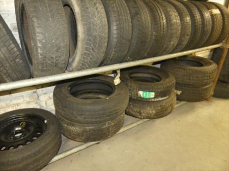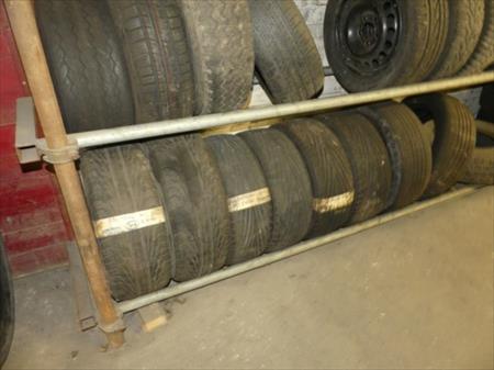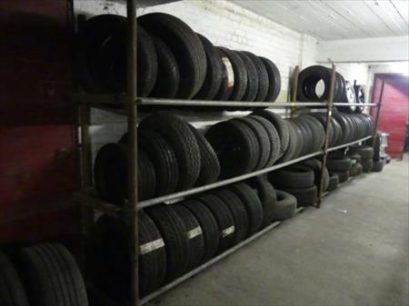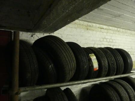 Rack à pneus et son contenu Longueur : 640 cm Largeur : 63 cm Hauteur : 200 cm Inclus : contenu Quantité : 60 pneus diverses dimensions et modèles (neufs et occasion) Remarques : visite conseillée