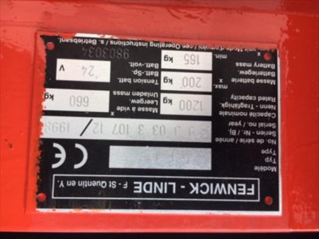 Gerbeur électrique Marque : Fenwick-Linde Modèle : T 12 Série : 379 J 03 3 107 12 Année : 1998 Capacité : 1200 kg