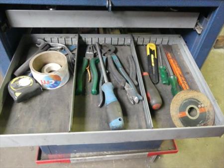 Servante d'atelier et son contenu + coffre à outils métallique Quantité : 1 Inclus : Contenu de la servante et du coffre à outils Dimensions de la servante : 39 cm x 61 cm x 93 cm