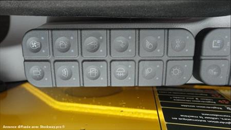 Hauteur hors tout: 2.49m; Largeur hors tout (aux pneumatiques): 2.34m; Largeur intérieure de la cabine: 0.97m; Voie avant: 1.81m; Empattement: 2.75m; Longueur hors tout aux pneumatiques avant: 4.38m; Longueur hors tout au tablier: 4.99m; Garde au sol: 0.37m; Distance du centre de la roue avant au tablier: 1.23m; Distance du centre de la roue arrière à larrière du châssis: 1.01m; Rayon de braquage aux pneumatiques: 3.7m; Angle de cavage du tablier (benne en position de transport): 42.6°; Angle de déversement du tablier (benne à hauteur maxi): 37.5° Transmission: 150 cv / 112 kW; Ventilateur réversible automatique; Déconnexion électrique 2/4 routes motrices; Différentiel à glissement limité sur le pont avant; Système de régénération hydraulique pour labaissement; Amortissement de fin de flèche pour le levage; Décompression rapide de la ligne auxiliaire, interne et externe; Contrôle proportionnel de léquipement; Système de suspension active SRS automatique; Ligne auxiliaire avant simple circuit double effet; Ligne auxiliaire arrière simple circuit double effet; Joystick monté sur l'accoudoir du siège; Climatisation manuelle; Vitre arrière chauffante; Phares de travail à LED, 2 sur avant cabine, 2 sur arrière cabine, 2 sur flèche, éclairage dattelage et éclairage intérieur; Option phares de travail à LED 360° : 2 supplémentaires sur cabine avant et 2 sur châssis arrière; Freins de remorque hydrauliques double ligne* avec prise électrique 7 broches et prise EBS; Crochet de remorquage; Kit de protection de flèche; Points de graissage arrière centralisés Michelin XMCL 460/70R24 traction agricole Monolevier servo avec 1 aux haut debit Cabine série III Siege pneumatique chauffant KAB avec joystick sur accoudoir Tablier Qfit à verrouillage hydraulique Manuel Français stage V séries III Prédisposition pour freinage pneumatique Protection sous la transmission