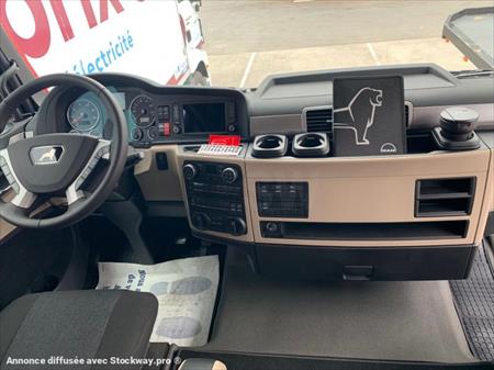 Tracteur mi-haut Cabine longue et Large Moteur D2676LF81 - 510 ch/375 KW Euro 6 SCR Bio gazole Frein moteur régulé EVBec Ralentisseur Hydraulique MAN PriTarder Boîte de vitesses MAN TipMatic®12 28 OD Logiciel de boîte de vitesses MAN TipMatic®Offroad (exploitation en tout-terrain) Fonctionnalité de boîte de vitesses: Dégagement et EfficientRoll Essieu droit à entraînement hydrostatique (MAN HydroDrive) Ressorts AV paraboliques 8,0 t version mi-haute Suspensions AR pneumatiques,13 t Pont AR à réducteurs planétaires avec Blocage de différentiel Avec roue de secours Réservoir à carburant de 590 l à droite et 80l dAdBlue Volant multifonction Système MAN Easy Start antirecul Signal de freinage d'urgence (ESS) ABS ASR (antipatinage au démarrage) CabineXL nordic isolé et suspension pneumatique pour cabine Siege chauffeur chauffant 1 couchette Pare choc acier en 3 parties Toit ouvrant mécanique Rétro chauffant avec réglage électrique Chauffage d'appoint EBERSPACHER Climatiseur régulation thermique automatique Glacière 2 gyrophares à LED Radio MAN MediaTruck Advanced 12 V avec écran couleur 7 pouces + SD de navigation EUROPE INTEGRALE Fonctionnalité mains libres pour deux téléphones portables (connectables au volant multifonctions et au réseau Bluetooth®)