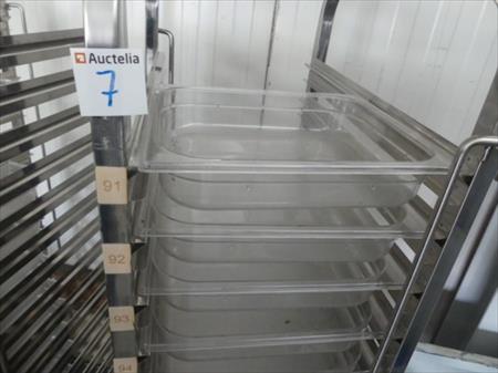 Chariot inox pour gastro Longueur : 60 cm Largeur : 40 cm Hauteur : 170 cm Quantité : 2 Fourni avec 30 gastro plastique GN1/2
