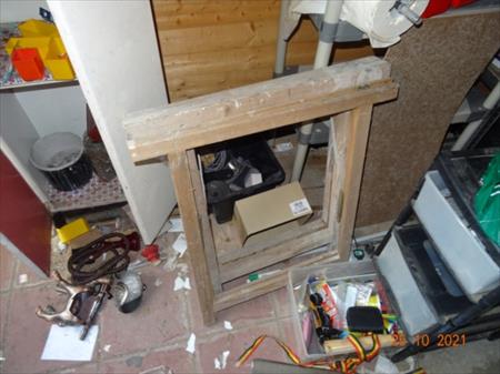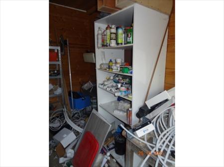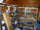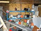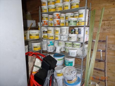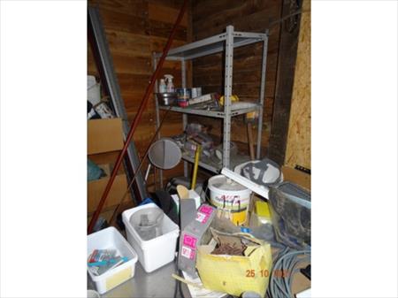 Contenu du local (une étagère rack bleu 6 lisses , étagères mécano , divers peinture, tréteaux , tables,,,,,) Lot situé à l'extérieur