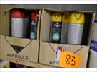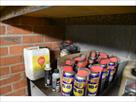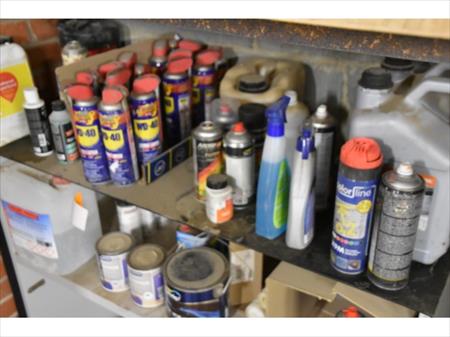 Étagère en bois, avec divers produits Peinture en bombe, huile pénétrante WD40, additif pour le ciment, Huiles, lubrifiant PVC,