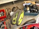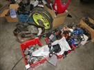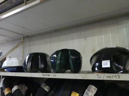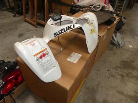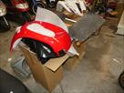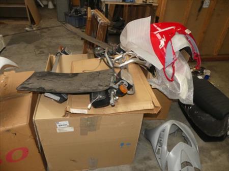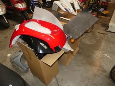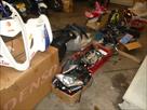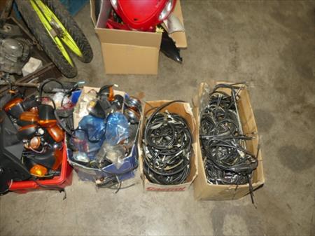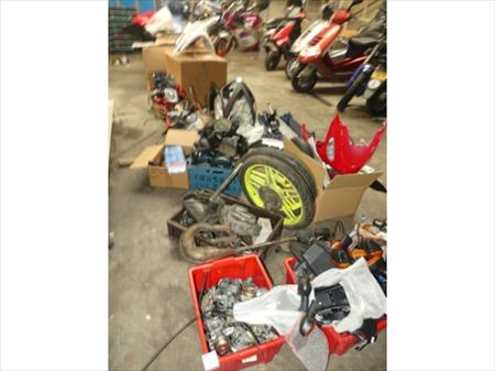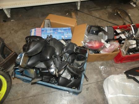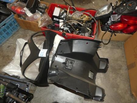 Pièces détachées pour motos, quads et scooters (grande quantité) Composition : Rétroviseurs, roues, moteurs, carénages, clignoteurs, phares, réservoirs, etc Lot tel que sur photos