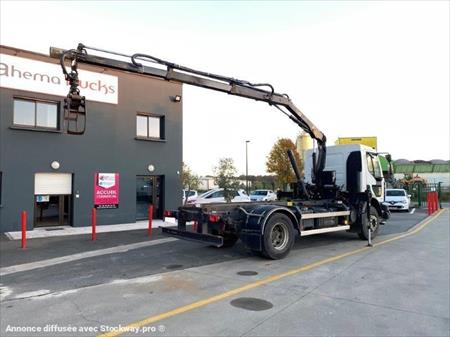 RENAULT MIDLUM 270dxi 4x25 châssis + grue HIAB 055 1 ère M.E.C : 01/07/2011 Kilométrage : 394960 km Motorisation : 270ch Boîte de vitesse : Automatique Pneumatiques : 11R22.5 Suspensions : mécanique PV : 9 T 383 PTAC : 16 T PTRA : 19 T 500 Norme : Euro 5 Equipements : GRUE HIAB 055 B - 2 HIDUO Portée : 660kg à 7.20m / 900kg à 5.40m / 1320kg à 3.80m 2 allonges hydrauliques Rotator + grappin 2 stabilisateurs Radiocommande Faux châssis + vérin frontal pour benne Cabine 2 places assises Autoradio Ventilation Ordinateur de bord Accoudoir conducteur