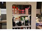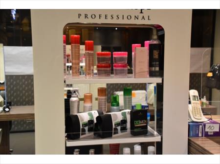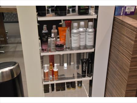 étagère enroulable, linscription SCHWARZKOPF, avec toutes sortes de neufs produits de soins capillaires et autres.