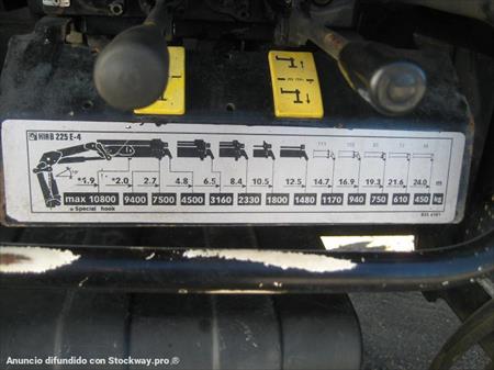 MOTOR CON 120.000 KMS.,CABINA CORTA CON TRES ASIENTOS, E/E, CRUISER, RADIO CD, BLOQ. DIFERENCIAL, TACOGRAFO ANALOGICO, BALLESTAS, MANUAL DE 8 VELOCIDADES, GRUA HIAB 225 E-4, CUATRO HIDRAÚLICAS,+ 1 MANUAL, MANDOS EN ALTO, ALCANCES: 4,8m.:4.500 kg., 6,5 m.:3.160 kg., 8,4 m.:2.330 kg., 10,5 m.:1.800 kg., 12,5 m.:1.480 kg., 14,7m.:1.170 kg., ruedas: 315/80 R 22,5: D: 70%, T: 80%, (15 EUROPALLETS)