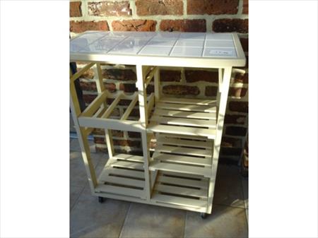Desserte en bois sur roulettes Dimension : Longueur : 70 cm Largeur : 37cm Hauteur : 83cm Horloge Diamètre : 60cm Etat : testée