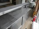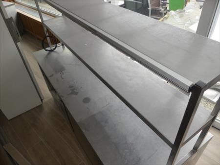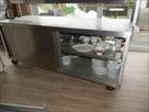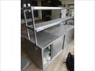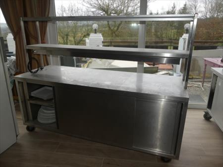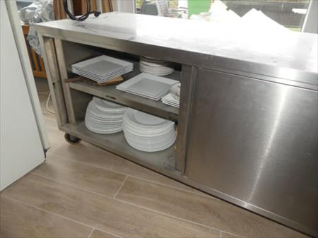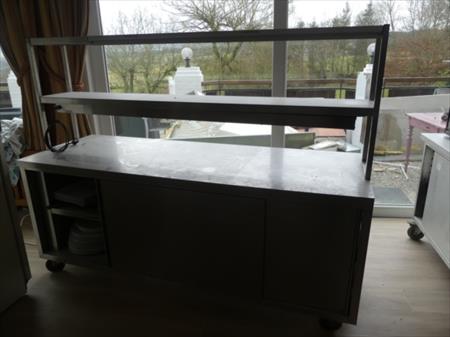 Comptoir inox self-service sur roulettes Marque : inconnu Longueur : 200 cm Largeur : 70 cm Hauteur : 156 cm Inclus : Contenu de vaisselles diverses Armoire 2 portes coulissantes de chaque côté, 1 tablette intérieure et 1 étagère inox chef fixée Equipée avec système maintien-chaud de marque Standex, modèle FD72L, 1250 W (non testé)