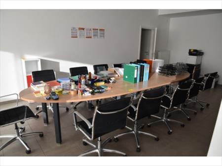Table de réunion ovale (+/-420 x 140 x 73 CMH) et 12 chaises bureel, pied étoilé, accoudoirs, rembourrage en tissu noir, réglable