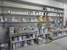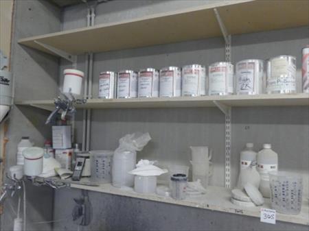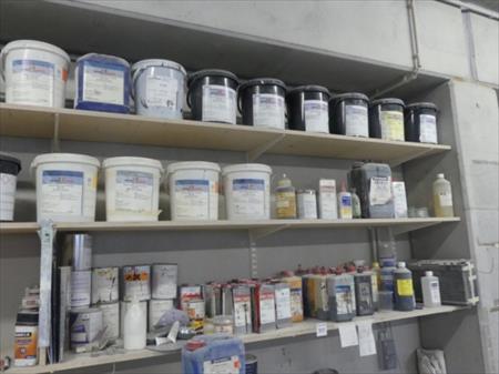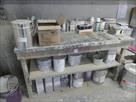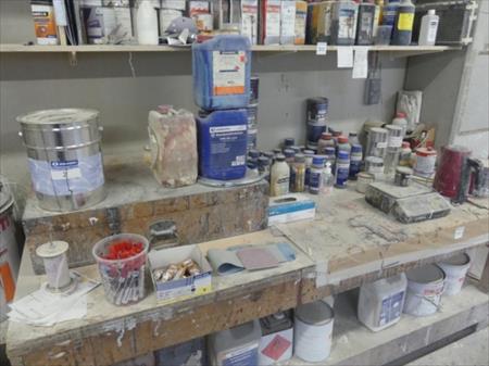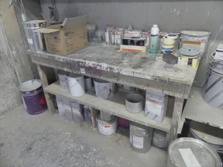 Solde de peinture, vernis et teintures pour bois (grande quantité) Longueur : 220 cm Inclus : Etabli et étagères Tout le contenu des établis et étagères Dimensions des 2 établis de travail : 1 x 220 cm x 90 cm x 78 cm 1 x 170 cm x 70 cm x 93 cm