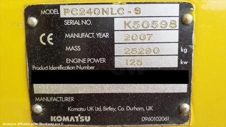 KOMATSU PC 240 NLC-8 Année 2007 10410 Heures Climatisation 1 Godet de Terrassement 25 Tonnes Puissance 125 KW ( 180 CH)