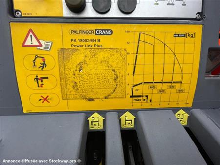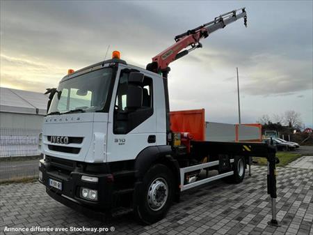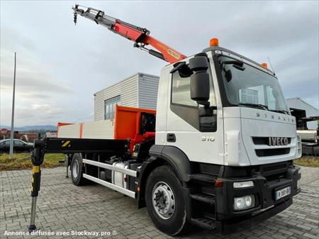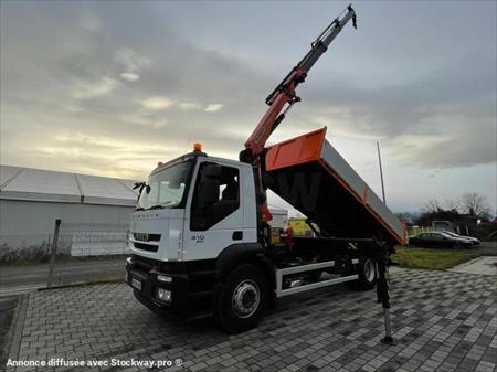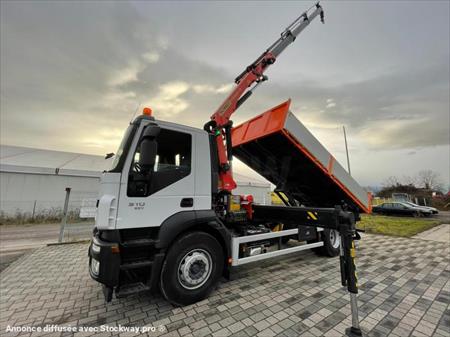 Marque: Iveco Modèle: Stralis 190S31 - Première immatriculation:17/06/2011 Kilomètres:266000 Kilomètres Configuration: 4x2 PTAC: 19.000 kg. Poids à vide: 11000 kg. Charge utile: 8000 kg. Euro 5 Empattement: 450 cm BENNE 550X247X60 Boîte AUTO GRUE PALFINGER 18TM Empattement : 4,5m Dimension de la benne : 2,45 x 5,5x 0,6m