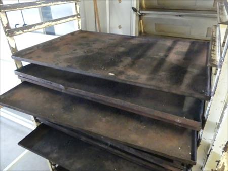 Chariots métallique sur roulettes pour plateaux Longueur : 66 cm Largeur : 40 cm Hauteur : 169 cm Quantité : 2 Nombre de niveaux : 20 par chariot Nombre total de plateaux fournit avec ce lot : 40