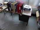 1 bureau d'angle métallique, tablette supérieure en bois, 5 tiroirs, 1dim. 200/170/77
