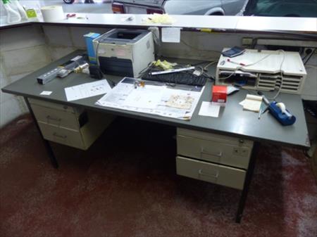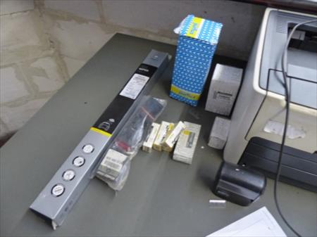 1 bureau métallique quatre tiroirs et son contenu dont bougies, ballets d'essuie-glace, filtres et 1 imprimante et 1 clavier d'ordinateur
