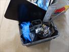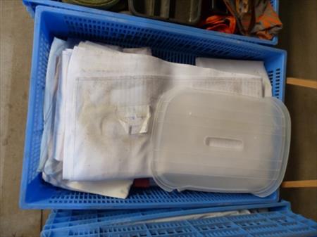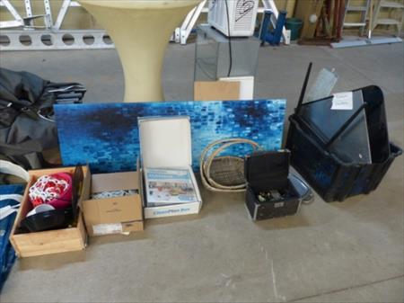 1 lot en tout genre dont une manne comprenant de l'outillage, accessoires, petit coffre, panier en osier, chaise PVC, paquet de poivre, 4 bacs bleus comprenant nappes diverses, sangles, verres