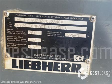 Pelle sur chenille LIEBHERR R 924 COMPACT de 2011 avec 10 028 heures Volée variable Attache rapide OILQUICK OQ70/55 Graissage centralisé Pompe a gasoil auxiliaire Commande proportionnelle Climatisation suivi par LIEBHERR Entretien à jour