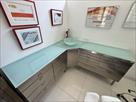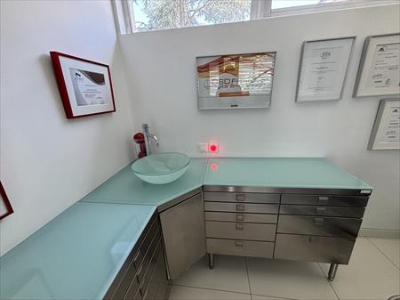 Magnifique meuble de rangement professionnel en acier inoxydable avec un plan de travail en verre dépoli. Idéal pour un cabinet médical, dentaire, ou tout autre usage professionnel nécessitant un espace de travail hygiénique et moderne.
