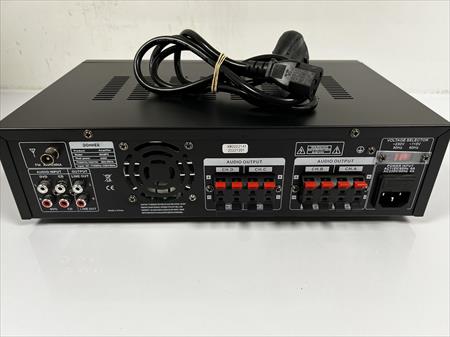 Fonction bluetooth, entrée USB, carte SD, 2 paires d’entrées audio RCA pour lecteur CD et DVD, 2 entrées microphone.