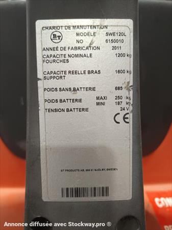 ATOUTLOC vous propose à la vente: Gerbeur électrique occasion – batteries neuves Marque: BT Modèle : SWE120L Année : 2011 Motorisation : Electrique Ht de levée : 2.70 m Capacité: 1200 kg 1088 Heures Poids : 935 kg Stock : ATL-SWE120 Prix Hors-Taxes, départ ATOUTLOC : 2 750 € HT Contrôle Vgp inclus. Livraison possible Pour tous renseignements, n’hésitez pas à nous contacter par mail à l'adresse suivante : contact@atoutloc.fr ; ou par téléphone au 03.27.22.34.65 Pour voir toutes nos machines, rendez-vous sur notre site internet atoutloc.fr ATOUTLOC 223 Avenue Jules Guesde 59124 ESCAUDAIN