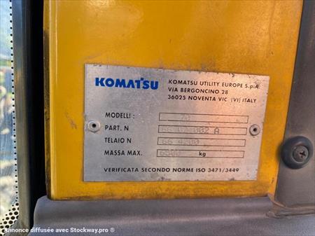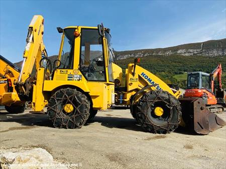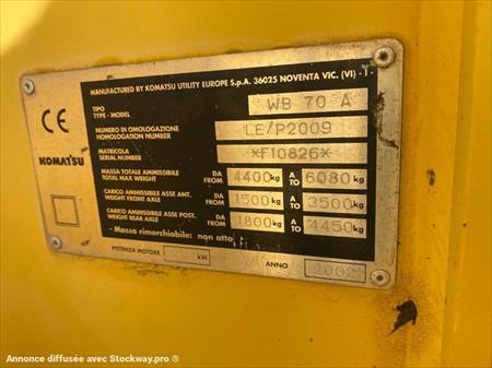 Tractopelle KOMATSU (NET DE TVA) Modèle WB70 N° de série 6602002A Année 2002 Heures 4549 HRS (évolutifs) Poids 6500 Kg 1 Godet drop Volume environ 700L Dimension : -Longueur 5.77 m -Largeur 1.85 m -Hauteur 3.15 m Roues avec chaînes Moteur VANGUARD Puissance 71 cv REPRISE ET LIVRAISON POSSIBLE.