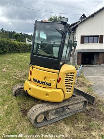 Mini-pelle KOMATSU type PC35MR-5 Année : 2019 Heures : 4000 Poids : 3.8 t Longueur en transport : 4.83 m - Largeur en transport : 1.74 m - Hauteur en transport : 2.56 m Largeur chenilles caoutchouc : 300 mm Moteur Komatsu type 3D88E 7 (18.2 kW) Attache rapide + 3 godets
