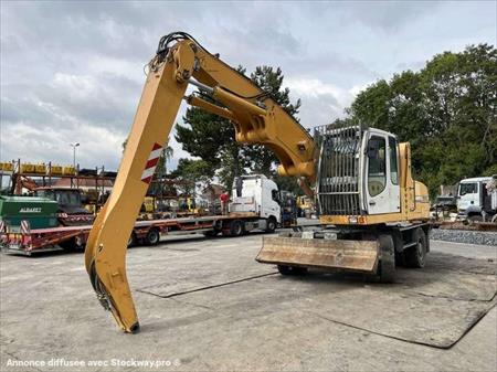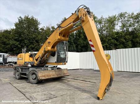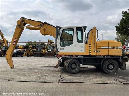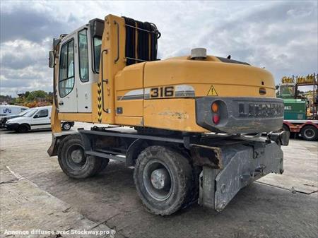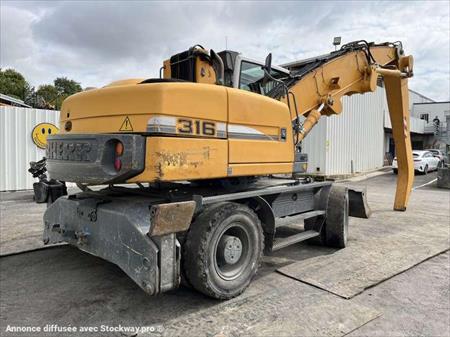 Cette pelle industrie de la marque Liebherr est le modèle A316 Litronic de 2010. Longueur : 8 M 75 Largeur : 2 M 55 Hauteur : 3 M 12 Poids : 19 T. Taille pneus : 10.00 - 20 Flèche monobloc Bras : 5 M 50 Balancier : 3 M 95 Pneus jumelés 2 stabilisateurs Lame Graissage automatique Clapets de sécurité Cabine élévatrice Siège monté sur amortisseurs Moteur Deutz TCD2013 L04V développe 94 kW (128 ch). 8901 Heures