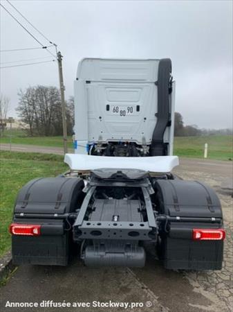 Couleur de la cabine +9147 blanc arctique Couleur 2 +9147 blanc arctique Pneus essieu 1 +F38LAA 80 315/70 R 22,5 Pneus essieu 2 +F38L99 81 315/70 R 22,5 Options +B3K Ralentisseur à huile secondaire +C8M Partie centrale de l'aile, basse +C8Z Carenage lateral, aerodynamique +D4Q Miroir de rasage +D5F Eclairage d'ambiance LED conduite et espace de vie +D5Y Tapis en caoutchouc conducteur et passager avant +D6C Climatiseur d appoint electrique +D6G Climatiseur automatique +D7K Tiroir, sous planche de bord +D7Y Rack a bagages, en haut paroi AR +D8M Toit ouvrant/relevable electrique, verre +F0T Etoile Mercedes, retroeclairee +F1H Cabine L BigSpace, 2,50 m, plancher plat +F2P Cabine, hauteur de plancher 765 mm +F3C Suspension cabine confort, pneumatique +F4Z Rangement sous cabine, cote gauche +F5B Deflecteur air reglable, avec deflecteurs lateraux +F5K Deflecteurs, libres +F9P Suppression MirrorCam +H2B Avancee de sellette +550 mm +J2K Haut-parleurs, systeme a deux voies +J2U Système de navigation +J6Y Remote Online +K2D Res.alu 680l+120l AdBlue,g.,650x700x2170,march. +K5Y Remplissage initial, 30 l de carburant suppl. +L1G Projecteur principal LED +L1P Feux arriere a LED +L3Z Lave-phares +MJC Coupure du moteur au bout de 3 minutes de ralenti +O3C Safety Pack +O3I Sight Package, avec phare LED +O3J Climate Package pr isolation acoustique/thermique +O8L Comfort Package +Q4I Hauteur de la sellette d'attelage, H = 150 mm +R2Y Jantes alu 9,00 x 22,5, Dura-Bright, Alcoa +R8A Support de roue de secours avec treuil +R8P Roue de secours/Jante pour roue de secours +S1I Assistant de regulation de distance +S1O Détecteur de panneaux de signalisation +S1Y Controle de la pression des pneus +S3A Airbag, conducteur +Y1X Refrigerateur, dans tiroir, sous le lit +Y4S Ampoules de rechange, dans boitier +Y4W Outillage de bord, etendu Options MPC +P3AA3N Véhicule 100% compatible XTL +X2TA6N Suppression Stickage OM 471 3ème génération +X9SU1N Véhicule complet en réception Euro +X9SV3N Contrat Service Extend 60 mois Equipement de série +A1C Essieu AV 7,5 t +A1Z Essieu AV coude +A2E Essieu AR, grande couronne 440, hypoide, 13,0 t +A3D Essieu arrière à graissage actif, non régulé +A5G Rapport de pont i = 2,412 +B1B Systeme de freinage electronique avec ABS et ASR +B1H Aliment. air compr. élec. et commande pneum. moyen +B2A Freins a disque a l'AV et a l'AR +B2X Frein de stationnement, électronique +B4M Reservoir d'air comprime, acier +B5J Raccords de frein et de syst. electr., pos. basse +C0G Porte-a-faux cadre 1050 mm +C1W Empattement 3700 mm +C5B Marchepied sur cadre, recouvrement partiel +C5D Acces, derriere cabine, cote gauche +C5P Cadre vissé +C6C Direction a simple circuit +C6I Pompe de direction assistee, regulee +C6Q Barre stabilisatrice, essieu AV +C7F Protection anti-encastrement AV (ECE), aluminium +C7T Module arriere integral +C8B Aile essieu AR, largeur de vehicule 2550 mm +C8H Aile en 3 parties, avec garde-boue CE +C8I Garde-boue (CE), AV +C8Y Habillage du soubassement aerodynamique +D0L Pack Fumeur +D0S Raccord air comprime, dans cabine +D1C Siege conducteur oscillant, confort +D1N Siege fonctionnel pour passager +D2N Dossier de siège, déverrouillage, siège conducteur +D2Y Temoin de controle des ceintures de securite +D3B Lit inferieur confort +D3M Matelas, PremiumComfort, en bas +D3Q Revêtement, velours, siège conducteur +D3T Revêtement, velours, siège convoyeur +D4E Surmatelas pour couchette confort en bas +D4T Rideau transversal, devant lit(s) +D4Y Store pare-soleil, lateral, cote conducteur +D5Z Tapis de sol, tunnel moteur +D6I Utilisation de la chaleur residuelle du moteur +D6M Chauffage additionnel a eau chaude, cabine +D6V Isolant thermique et sonore cabine +D7G Couvercle de compartiment de rangement cond./pass. +D7J Tiroirs, sous le lit +D7R Trappes de rangement, au-dessus du pare-brise +D8X Caisson de siège bas, 40 mm abaissé +E1T Alternateur régulé 24-30 V/100 A +E1Z AGM-Batteries, 2 x 12 V/220 Ah, sans entretien +E2J Disjoncteurs +E3L Prise 24 V/15 A, aux pieds du passager avant +E4B Interface, systeme de gestion de flotte FMS +E5A Commutateur electr. nr. 1 pour carrosserie non MB +E6A Prise de remorque 24 V, 15 poles +E6E Adaptateur, prise 15 poles sur 2x7 poles +E6Z Avertisseur de marche arrière +E7F Telecommande par cable pour suspension pneumatique +F0F Module latéral, véhicule N3 +F0X Cache de retroviseur, vehicule routier +F1R Cabine L +F2A Variante de plancher, plancher plat +F2H Largeur de cabine 2,50 m +F2V BigSpace +F3W Dispos. de basculement de cabine, mecan.-hydraul. +F4H Paroi AR de cabine, sans vitre +F4X Trappe ext. du compartiment de chargement, gauche +F4Y Trappe ext. du compartiment de chargement, droite +F5L Pare-soleil exterieur, transparent +F5Y Habillage du montant A +F6D Pare-brise teinte, avec bandeau pare-soleil +F6I Anteviseur aerodynamique chauffant +F6Q Avertisseur sonore pneumatique +F7A Pare-chocs, angles en plastique +F7C Pare-chocs, partie centr. ac oeillets de remorqu. +F7T Porte rallongee +F7X Acces cabine gauche/droite, fixe +F8B 2 cles a telecommande +F8E Systeme de verrouillage centralise +F8F Systeme de fermeture confort +F8H 2 cles a telecommande supplementaires +F8V Capteur de luminosité +F8W Détecteur de pluie +G0K Programme de conduite economy/power +G0T Predictive Powertrain Control +G2E Boite de vitesses G 281-12/14,93-1,0 +G5A Embrayage monodisque +G5G Mercedes PowerShift 3 +G5L PowerShift Advanced +I4A Roues 4x2 +I5A Vehicule 18,0 tonnes +I6D Tracteur de semi-remorque +I6K Gamme lourde, nouvelle génération à partir de 18 t +I6N Véhicules lourds à partir de 18 t, on road +I6X Suspension pneumatique essieu AR +J1M Tachygraphe, numérique, 2egénération,version 2,ADR +J1S Fabricant de tachygraphes VDO +J2G Autoradio numérique DAB+ +J3U Prérequis FleetBoard Manager App +J3V Truck Data Center 7 +J6C Multimedia Cockpit, interactive +J6Z Prééquipement portail appli Mercedes-Benz Truck +J8Y Prééquipement pour Truck