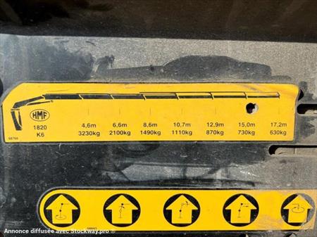 MAN TGS 18.480 4x2 GRUE HMF 1820 1ère M.E.C : 29/04/2014 Kilométrage : 426 088km Motorisation : 12419cm3 - 480ch Norme : Euro 6 / Adblue Boîte de vitesse : Automatique Suspension : AV méca / AR air Pneumatiques : 315/80R22.5 PV : 9.955T PTAC : 19T PTRA : 44T l x L : 2.5 x 6.21m Equipements : GRUE HMF 1820 K6 ( 18T/m) 6 allonges hydrauliques 3230kg - 4.6m / 2100kg - 6.6m / 1490kg - 8.6m / 1110kg - 10.70m / 870kg - 12.90m / 730kg - 15m / 630kg - 17.20m Radiocommande Poste de commande manuelle 2 stabilisateurs Radiateur d'huile 2 coffres PVC Sellette pour attelage semi-remorque Cabine basse et profonde : 2 places 1 couchette Autoradio CD Commandes au volant Régulateur de vitesse Climatisation Toit ouvrant Vitres et rétroviseurs électriques Dégivrage des rétroviseurs Trappe de rangement sous couchette