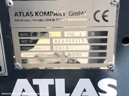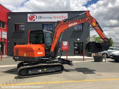 LOCATION : 199€HT par jour Livraison possible jusqu'à 30km de DERVAL 44590 50€HT l'aller et 50€HT le retour MINI PELLE ATLAS AC 60 NEUVE Année : 2018 Poids en ordre de marche : 5 900 Kg 3 godets Flèche à volée variable Lame avant Attache rapide hydraulique Chenille cahoutchouc Phares de travail à leds x3 Climatisation Autoradio