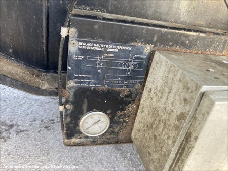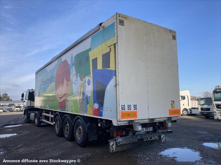Fond mouvant SOCARI avec grue JONSERED 1420 Volume du fond mouvant : 55 mètres cubes. Volet papillon, porte arrière hydraulique, Portée de la grue 9.60 mètres avec 1260 Kg. Suspensions pneumatique avec dernier essieux suiveur.