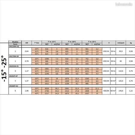 Puissance frigorifique rendue 1258 (W/f) pour chambre volume 10,2 m³/10200L (T° interne -20°C et T° externe +32°C).