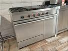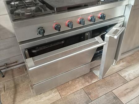 Piano de cuisine inox AMBASSADE 4 feux + plaque coup de feu + four + coin rangement, tout gaz