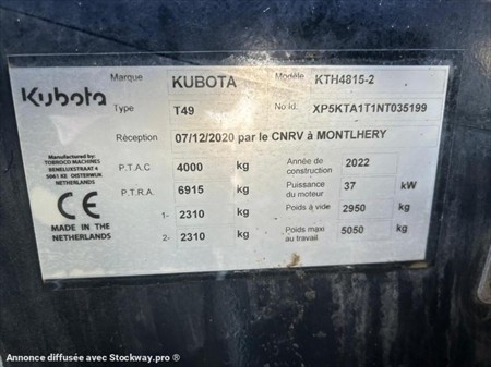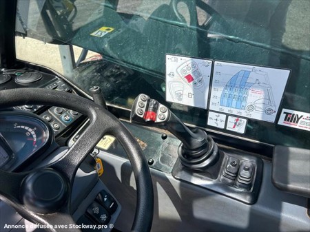 Kubota KTH4815-2 Numéro de stock : 7390 Marque : Kubota Modèle : KTH4815-2 Année : 2022 Heures : 920h Numéro de série : XP5KTA1T1NT035199 Poids : 2950kg Capacité de levage : 1.5T Hauteur : 1m97 Largeur : 1m60 Longueur : 3m14 Hauteur de levage : 4.8m Pneus avant : 31x15.5-15 Pneus arrière : 31x15.5-15 Usure pneus avant : 40% Usure pneus arrière : 40% Roues motrices : 4RM Moteur : Kubota 3 cylindres 50CV Accessoires : - Ligne auxiliaire - Godet - Fourche à palette Commentaire : - Monolevier - Possibilité d'être transporter sur plateau 3.5T Tarif vendu dans l’état : 45 000€ H.T (TVA à 20% récupérable pour les professionnels) Possibilité de matériel vendu révisé, vidangé et garantie pour un supplément de 3 000€ HT. Nous sommes une entreprise multimarques spécialisée dans le négoce de matériels TP et Agricoles dans les Deux-Sèvres. Une large gamme de produits est disponible sur notre parc : Mini pelle, chariot télescopique, dumper, remorques et autres matériels divers. Nous pouvons assurer des livraisons dans toute la France.