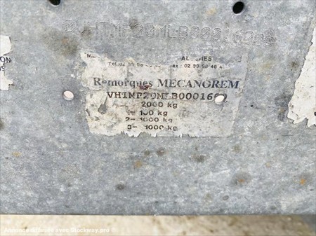 Remorque MECANOREM N° de série VHTMP20MLB0001600 N° d'immatriculation BQ-280-SJ Poids à vide 610 Kg PTAC 2000 Kg Poids par essieu 1000 Kg Dimensions plateau : -Longueur 3.72 m -Largeur 2 m -Rampes 1.42 m Pneus BON ÉTAT 165 R 13C ------------- Lors de sa réception, un employé qualifié de DB EQUIPMENT a effectué un contrôle des éléments essentiels du matériel, et a pu constater : son bon fonctionnement général. Ce matériel est disponible sur parc, et peut être essayé sur nos horaires d'ouverture sur simple rendez-vous. REPRISE ET LIVRAISON POSSIBLE Nous nous efforçons de publier des informations les plus précises possibles mais aucun droit ne peut être tiré des textes publiés.