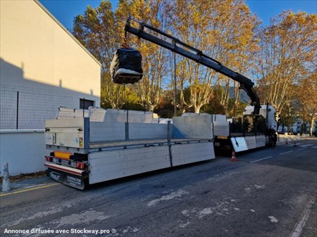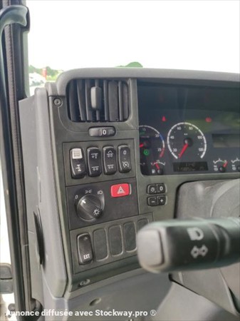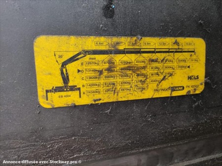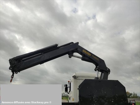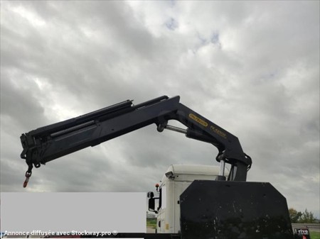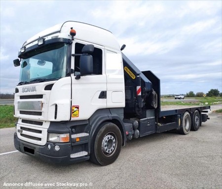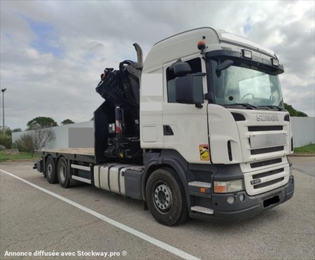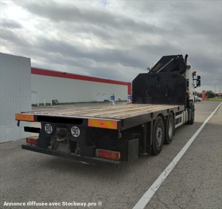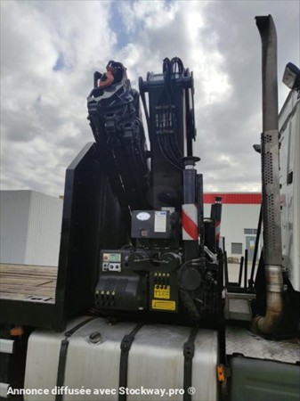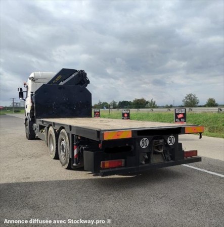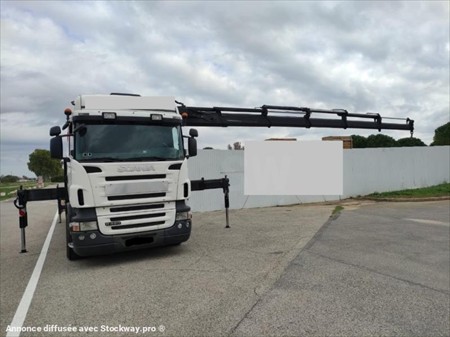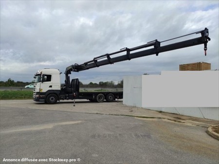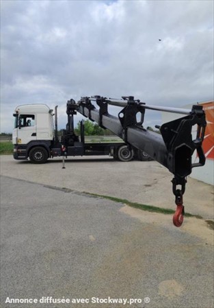 CAMION PLATEAU RIDELLES GRUE + REMORQUE RIDELLES 2 ESSIEUX 6X2 ESSIEU RELEVABLE DE MARQUE SCANIA R420 800000 KMS DU 10/06/2008 PLATEAU AVEC TWISTLOCKS LONGUEUR 6M30 X 2M55 + ALLONGE HYDRAULIQUE DE 1M 3 RIDELLES MANUELLE PAR COTE HAUTEUR DU PLATEAU1M20 REMORQUANT COFFRES + PANIERS ECHAPPEMENT VERTICAL CASQUETTE GYROPHARES + GRUE PALFINGER PK 42502 PERFORMANCE 5 ALLONGES PIEDS STABILISATEURS AVANT ET ARRIERE BOITE MECANIQUE RALENTISSEUR 2 COUCHETTES REGULATEUR ET LIMITEUR DE VITESSE CLIMATISATION BLOCAGE PONT AUTORADIO REMORQUE PLATEAU RIDELLES 2 ESSIEUX 2 RIDELLES MANUELLE PAR COTE