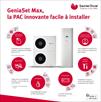 GeniaSet Max 15 est une pompe à chaleur double service très simple à mettre en place. Composée de l’unité extérieure monobloc « GeniaAir Max 12 (réf. 0010031698) et de l’unité intérieure GeniaSet Max (réf. 0010036670) elle permet d’atteindre 75 °C départ à 0 °C extérieur et jusqu’à 65 °C à – 10 °C. Compatible avec tous types d’émetteurs en place (radiateurs, planchers chauffants et ventilo-convecteur) la pompe à chaleur GeniaSet Max 15 est une solution idéale pour un projet en neuf, mais également dans le cadre d’une rénovation. Répondant aux dernières normes et réglementations en vigueur elle est certifiée NF PAC. L’unité intérieure intègre un ballon d’eau chaude sanitaire d’une capacité de 190 litres lui permettant de répondre aux besoins d’une famille de 5 personnes. Pour augmenter ce confort sanitaire et en fonction des sollicitations, l’ECS peut être stocké jusqu’à 70 °C. En termes de performance énergétique, la GeniaSet Max 15 affiche de très bons résultats :