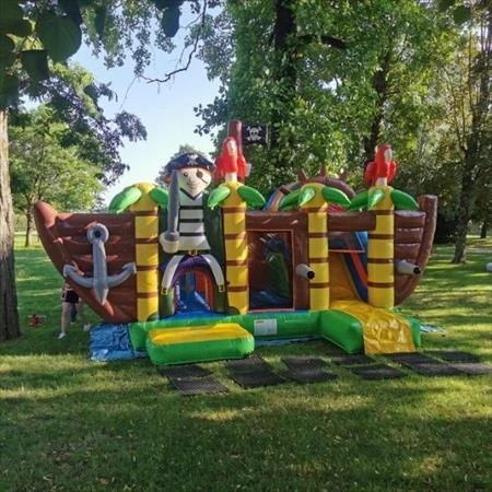 Je vends ce château gonflable bateau pirate avec son moteur (soufflerie). Dimensions : L 8 x P 5.1 x H 4.3 m. Accessible à tous, des tout-petits aux plus grands— capacité maximale : 12 personnes en flux continu.. 1 prise 220V 16A Accueillis par un pirate gonflé de 4 mètres de hauteur, les enfants s'amuseront à jouer aux apprentis pirates, faire la course, jouer à cache-cache, multiplier les positions et les acrobaties pour parvenir au bout de la structure à vitesse grand V. Rebondir, sauter, se défouler, tomber, déraper... toutes les figures acrobatiques sont permises dans ce jeu gonflable protégé qui promet des heures de chahut et des fous-rires illimités... en toute sécurité. Et pour un finish en toute beauté : les enfants pourront grimper puis dévaler un grand toboggan gonflable riche en couleurs.