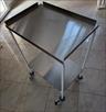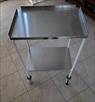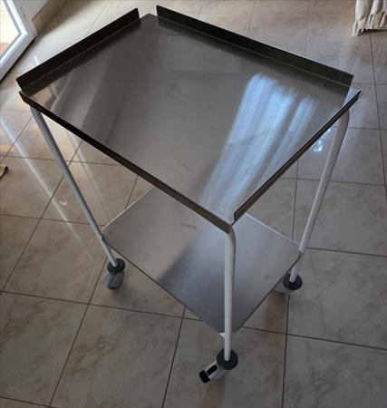 Guéridon médical, état neuf, 2 plateaux, 85cm haut.40 profondeur et 60 de largeur, plateaux inox dont le supérieur avec 3 rebords, sur 4 roulettes dont 2 avec frein