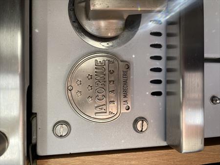 Superbe piano de cuisson La Cornue Château 120, modèle iconique fabriqué à la main dans les ateliers parisiens de la marque.Finition rare Inox satiné & Laiton brossé, gravure personnalisée « La Maréchalerie » sur la plaque frontale.