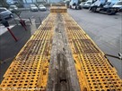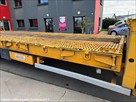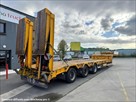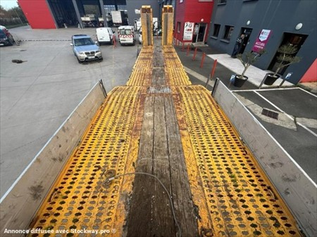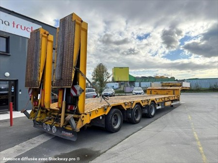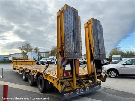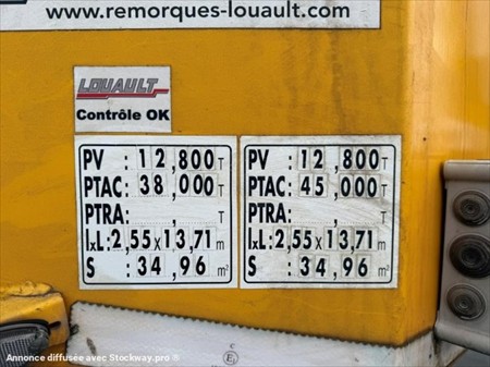 Semi-remorque LOUAULT 3 essieux porte engins 1ère M.E.C : 07/12/2018 Essieux : 3 de marque SMB Pneumatiques : 255/60R19.5 Suspension pneumatique l x L : 2.55m x 13.71m PV : 12.800T PTAC : 38 / 45 T Equipements : Plateau bas : 9.15m Col de cygne : 3.55m Largeur : 2.53m Table élévatrice Rampe double avec translation Longueur rampe : 4.25m Coffre sur col de cygne Groupe électrohydraulique pour rampe Treuil électrique Plancher caillebotis + bois 3 ème essieu suiveur Elargisseurs Anneaux d'arrimages