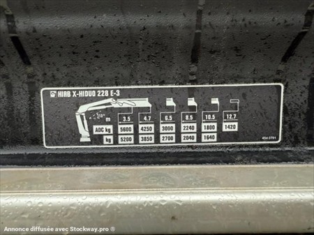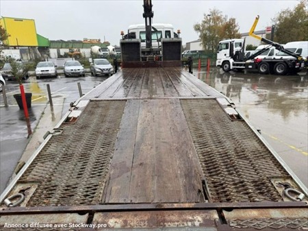 MAN TGS 35.360 8x2 Porte engins grue HIAB 228 1ère M.E.C : 20/11/2018 Kilométrage : 205 017km Motorisation : 370ch - Euro 6 Boîte de vitesse : automatique Essieux : 8x2 Suspension : pneumatique arrière 4 ème essieu relevable PV : 16.649T PTAC : 32T PTRA : 44T l x L : 2.55 x 11.80m Pneus : 315/80R22.5 Equipements : Grue HIAB X-HIDUO 228 E-3 3 allonges hydraulique : portée 1800kg à 10.50m Radiocommande 2 stabilisateurs Plateau porte engins : plancher bois omega, acier Longueur utile : 8.15m Anneaux d'arrimage Treuil hydraulique 6 x gyrophares 2 x coffre pvc Cabine : 2 places assises Autoradio Bluetooth Climatisation Régulateur de vitesse Toit ouvrant Blocage de différentiel Aide au démarrage en côte