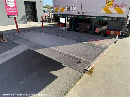 MERCEDES ACTROS 1840 4x2 PLSC + HAYON 1 ère M.E.C : 03/12/2015 Kilométrage : 786 358km Motorisation : 400ch Norme : Euro 6 Boîte de vitesse : automatique Essieux : 4x2 Suspension : pneumatique AV et AR Pneumatiques : 315/80R22.5 PV : 11T095 PTAC : 19T25 PTRA : 44T25 l x L : 2.55 x 11.09m Empattement essieu 1 à 2 : 6.10m Ralentisseur Equipements : Caisse savoyarde LIBNER Dimensions utiles : 8.45m x 2.47m x H : 2.55m 3 ridelles par côté 2 portes arrière Hayon DHOLLANDIA rétractable : 1500kg Cabine : courte 2 places assises Autoradio CD / Tel Commande au volant GPS Fleetboard Climatisation Tachygraphe numérique Régulateur de vitesse Aide au démarrage en côte Vitre électrique Toit ouvrant Une couchette