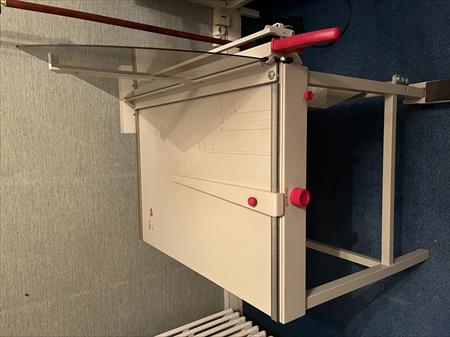 Cisaille professionnelle (jusqu’à A2), découpe jusqu’à 800 mm, poids 55 kg, dimensions 60,5 x 80 cm, particulièrement adaptée pour travaux de reliure, décoration, encadrement, photo, etc. Très bon état.