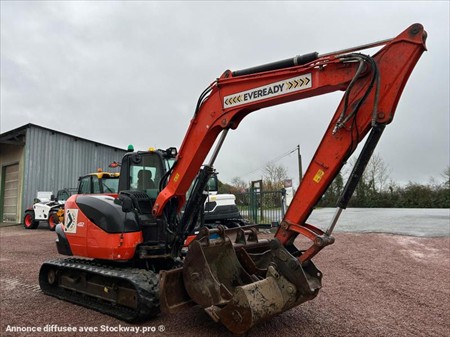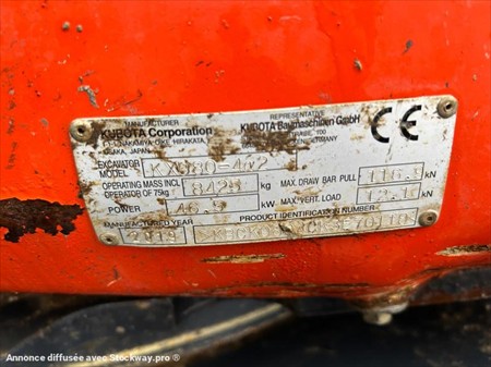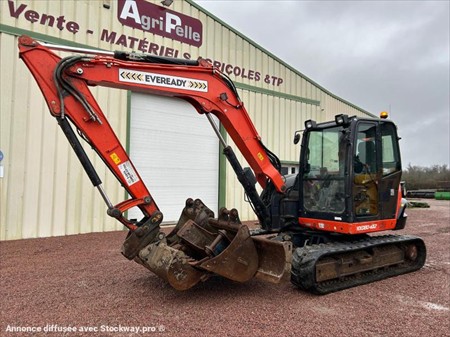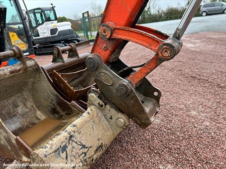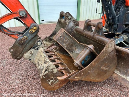 Kubota KX080-4 : Numéro de stock : 7871 Marque : Kubota Modèle : KX080-4 Année : 2019 Heures : 4556h Numéro de série : 70118 Poids : 8190kg Hauteur : 2m54 Largeur : 2m20 Longueur : 6m45 Chenilles : Caoutchouc Usure chenille droite : 30% Usure chenille gauche : 70% Nombre de godets : 4 2 Vitesses : Oui Moteur : Kubota 4 cylindres Accessoires : - Double ligne auxiliaire - Attache rapide hydraulique - Clim Tarif vendu dans l’état : 33 500€ H.T (TVA à 20% récupérable pour les professionnels) Possibilité de matériel vendu révisé, vidangé et garantie pour un supplément de 4 500€ HT. Nous sommes une entreprise multimarques spécialisée dans le négoce de matériels TP et Agricoles dans les Deux-Sèvres. Une large gamme de produits est disponible sur notre parc : Mini pelle, chariot télescopique, dumper, remorques et autres matériels divers. Nous pouvons assurer des livraisons dans toute la France.