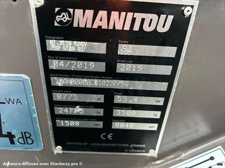 Manitou MT1135 Numéro de stock : 7898 Marque : Manitou Modèle : MT1135 Année : 2019 Heures : 2250h Numéro de série : 122779 Poids : 8800kg Capacité de levage : 3.5kg Hauteur : 2m42 Largeur : 2m28 Longueur : 5m37 Hauteur de levage : 11m Pneus avant : 400/80-25 Pneus arrière : 400/80-25 Usure pneus avant : 60% Usure pneus arrière : 60% Roues motrices : 4RM Moteur : Deutz 4 cylindres 75CV Accessoires : - Fourche à palette - Ligne auxiliaire - Monolevier - Correcteur de devers Tarif vendu dans l’état : 45 000€ H.T (TVA à 20% récupérable pour les professionnels) Possibilité de matériel vendu révisé, vidangé et garantie pour un supplément de 3 500€ HT. Nous sommes une entreprise multimarques spécialisée dans le négoce de matériels TP et Agricoles dans les Deux-Sèvres. Une large gamme de produits est disponible sur notre parc : Mini pelle, chariot télescopique, dumper, remorques et autres matériels divers. Nous pouvons assurer des livraisons dans toute la France.