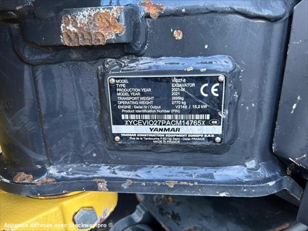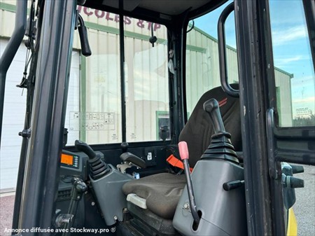 Yanmar VIO27-6 Numéro de stock : 7878 Marque : Yanmar Modèle : VIO27-6 Année : 2021 Heures : 1944h Numéro de série : YCEVIO27PACM14765 Poids : 2770kg Hauteur : 2m53 Largeur : 1m50 Longueur : 4m12 Chenilles : Caoutchouc Usure chenille droite : 40% Usure chenille gauche : 40% Nombre de godets : 3 2 Vitesses : Oui Moteur : Yanmar 3 cylindres Accessoires : - Ligne auxiliaire - Attache rapide mécanique Tarif vendu dans l’état : 24 500€ H.T (TVA à 20% récupérable pour les professionnels) Possibilité de matériel vendu révisé, vidangé et garantie pour un supplément de 2500€ HT. Nous sommes une entreprise multimarques spécialisée dans le négoce de matériels TP et Agricoles dans les Deux-Sèvres. Une large gamme de produits est disponible sur notre parc : Mini pelle, chariot télescopique, dumper, remorques et autres matériels divers. Nous pouvons assurer des livraisons dans toute la France.